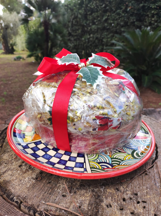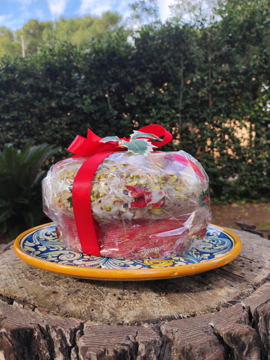 Regalo Siciliano: Panettone artigianale farcito al pistacchio e piatto in Ceramica di Caltagirone